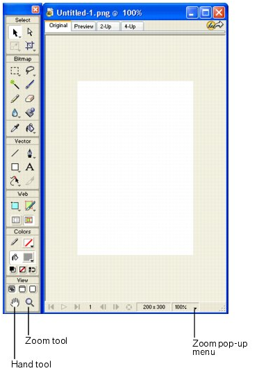Fireworks lets you zoom in or out at a preset or user-defined magnification percentage.